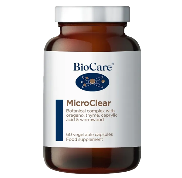 - BioCare MicroClear is a high potency complex of oregano, thyme, clove, olive leaf, wormwood, caprylic acid, and grapeseed extract for gut microbial balance
