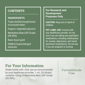 Methylene blue is a dye that has been used throughout history for a variety of scientific applications. Our specially-formulated methylene blue is 99.99% USP/Pharmaceutical Grade, formaldehyde-free, and made in the USA in Phoenix, Arizona. It comes in a 59 mL glass bottle for easy dispensing and potency preservation. Our products undergo rigorous third party testing to ensure consistency and quality. We pride ourselves on the quality of our ingredients and we just know you’ll love your results!